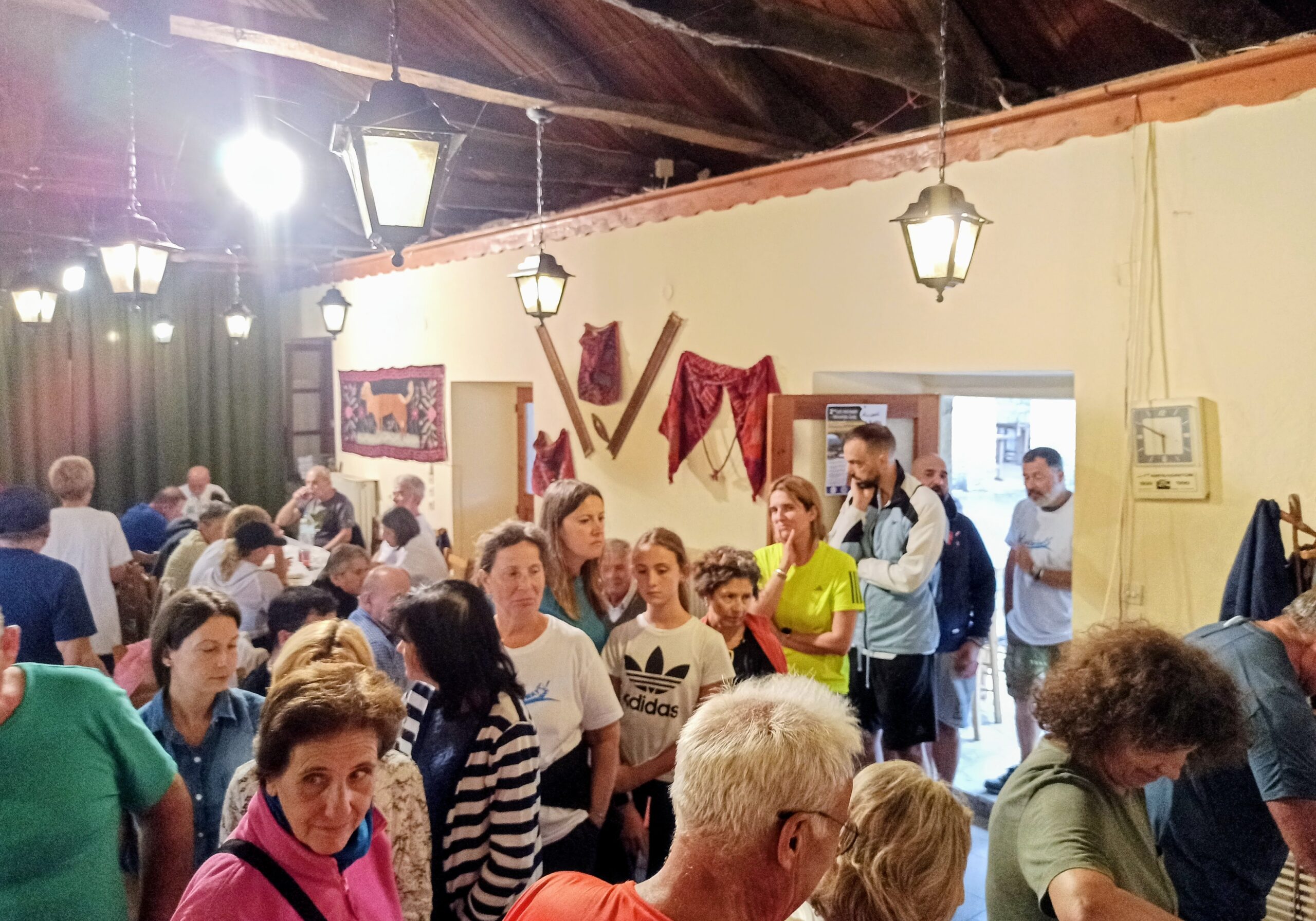 Η τετράωρη αυτή πεζοπορία, σχεδόν οχτώ χιλιομέτρων, μέτριας δυσκολίας, σε ασφαλές πλαίσιο, επισφραγίστηκε με φαγοπότι στο οποίο δέσποζε η τοπική ψητή γουρουνοπούλα!Δεν έλειψε από τον εορτασμό η μουσική, υπό την επιμέλεια του Εθελοντή, συμμετέχοντα πεζοπόρου και φίλου Καραΐσκου Αλέξανδρου, γεγονός που επιτελέστηκε με άκρατο κέφι μέχρι αργά το απόγευμα, παρά και την καταρρακτώδη βροχή που διαδέχτηκε τον δυνατό μεσημεριανό ήλιο. Οι παρευρισκόμενοι γέμισαν ασφυκτικά το εσωτερικό του πολιτιστικού κέντρου και μεγάλο μέρος του προαύλιου χώρου, δίνοντας ζωντάνια στην εκδήλωση.
